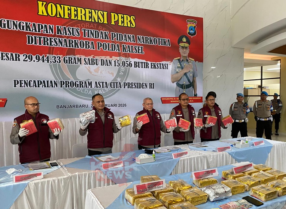 KBK.News, BANJARBARU – Kepolisian Daerah Kalimantan Selatan (Polda Kalsel) kembali menggagalkan peredaran narkotika dalam jumlah besar di wilayahnya. Sebanyak 29.944,33 gram sabu dan 15.056 butir ekstasi berhasil diamankan dari seorang tersangka yang diduga terafiliasi jaringan internasional Fredy Pratama.