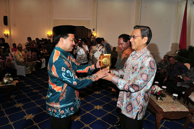 “Sebuah kebanggaan dan kebahagiaan luar biasa bagi saya pribadi dan  atas nama negara bisa bersilaturahmi dan berjabat tangan  dengan kepala daerah, masyarakat  serta tokoh adat penyelamat lingkungan,” ucap Wakil Presiden RI Prof Dr Boediono .