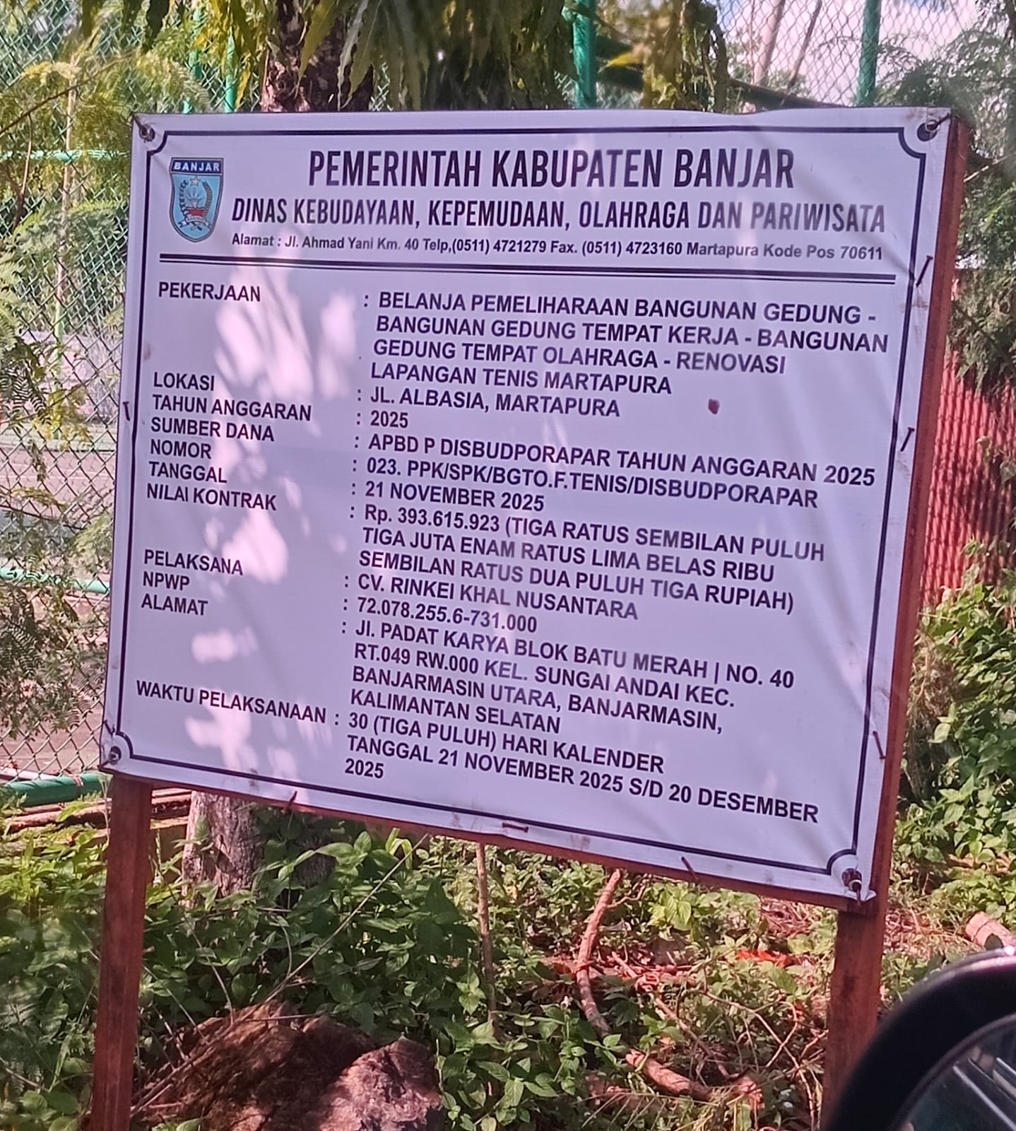 Proyek renovasi tersebut diketahui menelan anggaran sebesar Rp393 juta yang bersumber dari APBD Kabupaten Banjar Tahun 2025. Berdasarkan papan proyek, pekerjaan dinyatakan selesai pada 20 Desember 2025.