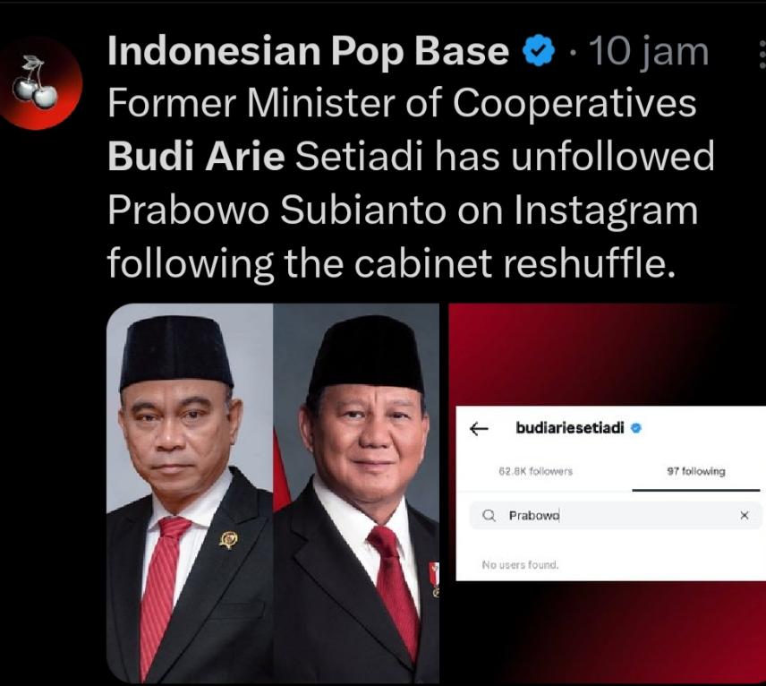 Informasi pertama kali diungkap akun @IndoPopBase yang menuliskan, “Mantan Menteri Koperasi Budi Arie Setiadi telah meng-unfollow Prabowo Subianto di Instagram usai kena reshuffle kabinet.” Cuitan itu langsung mendapat sorotan luas dari warganet.