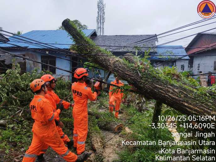 Tim BPBD Kota Banjarmasin yang menerima laporan langsung turun ke lokasi untuk melakukan pembersihan batang pohon dan memastikan keamanan instalasi listrik.