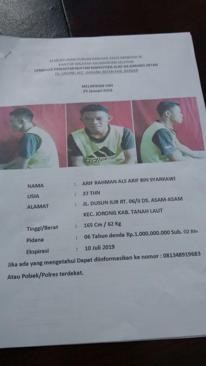 Seorang pemuda yang menjadi warga binaan Lapas Narkoba Karang Intan Martapura, berhasil kabur dari Lapas ini setelah melewati sebuah teralis ruangan di dalam Lapas . Pemuda ini bernama Arif Rahman berusia 37 Tahun Warga dari Asam – Asam ,Jorong ,Tanah Laut.