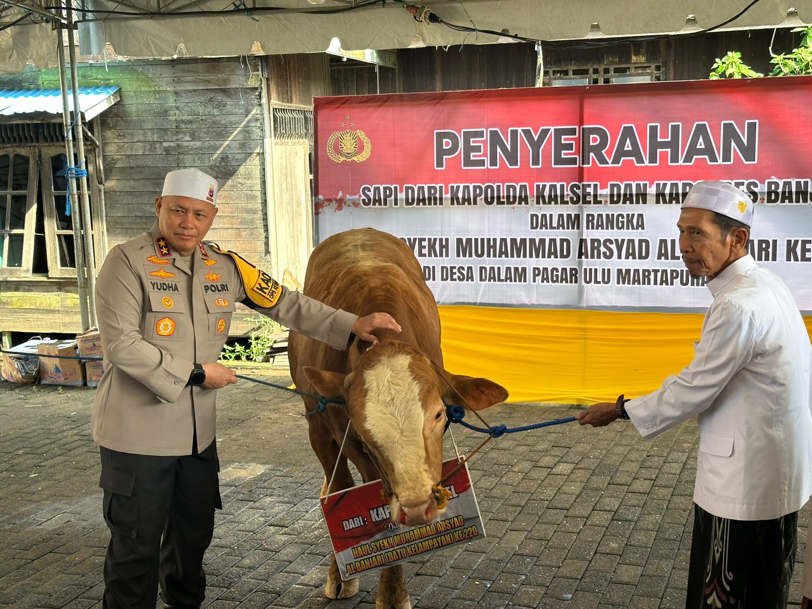 Kapolda Kalimantan Selatan Irjen Pol. Dr. Rosyanto Yudha Hermawan menyerahkan satu ekor sapi jenis limosin berbobot sekitar 200 kilogram, Selasa (24/3/2026) pagi. Penyerahan dilakukan di halaman Masjid Tuhfaturraghibin, Desa Dalam Pagar, Kecamatan Martapura Timur, Kabupaten Banjar.
