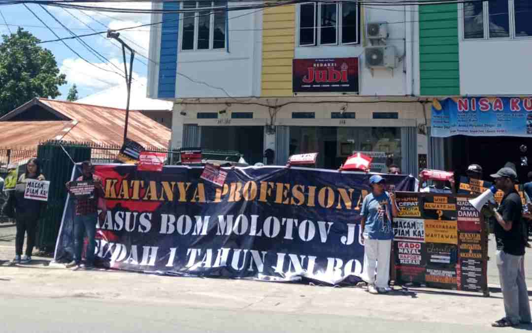 “Kami memperingati satu tahun kasus teror bom molotov yang menimpa kantor dan aset kami. Hingga hari ini, 16 Oktober 2025, proses hukumnya belum menunjukkan perkembangan yang berarti,” tegas Bisay di lokasi aksi.