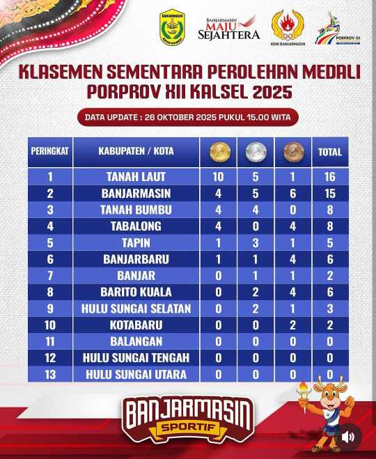 KBK.NEWS PLEIHARI – Tim tuan rumah Kabupaten Tanah Laut (Tala) memimpin perolehan medali sementara di ajang Porprov Kalsel XII dengan 10 medali emas, 4 perak, dan 2 perunggu, Minggu (26/10/2025).