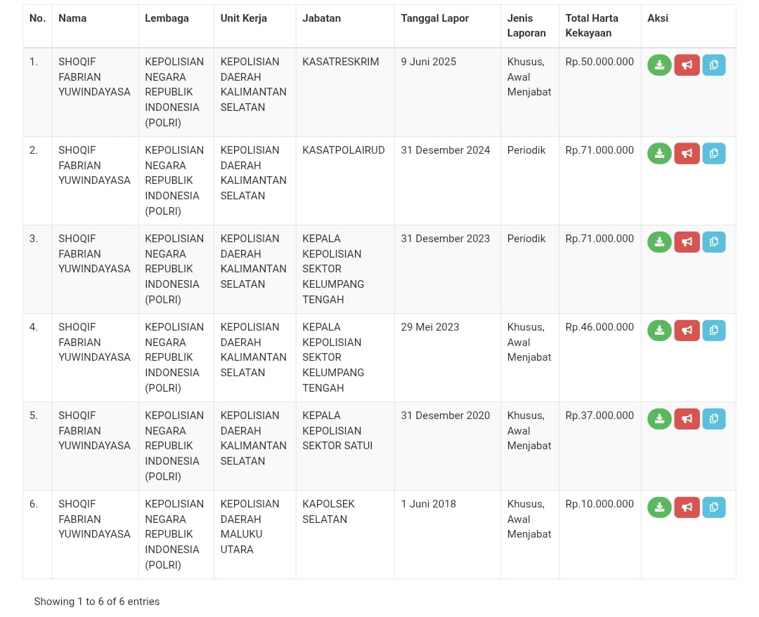 Laporan periodik pada 31 Desember 2023 menunjukkan nilai harta tetap Rp71.000.000 dengan jabatan yang sama, dan angka tersebut juga tercatat dalam laporan periodik 31 Desember 2024 ketika ia tercatat menjabat sebagai Kasat Polairud Kepolisian Daerah Kalimantan Selatan. Namun, dalam laporan khusus awal menjabat sebagai Kasatreskrim Polres Kotabaru pada 9 Juni 2025, nilai hartanya justru turun menjadi Rp50.000.000.