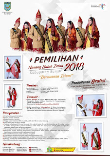 Bagi muda-mudi usia 16 hingga 24 yang masih single bisa mengikuti pemilihan tersebut. Sedangkan formulir pendaftaran bisa diperoleh di kantor Dinas Kebudayaan dan Pariwisata Kabupaten Banjar di Jl Ahmad Yani Km 39 Martapura, atau bisa juga langsung didownload dibit.ly/formulirpemilihan NGI2018.
