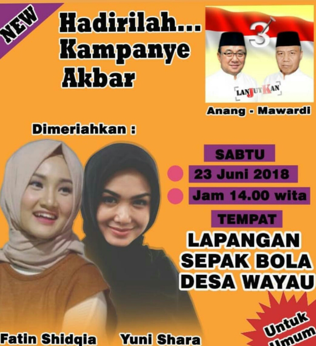 Kemudian pada kampanye akbar yang digelar Paslon Bupati Tabalong 2018 ini juga akan menghadirkan artis ibukota untuk menghibur para pendukung ,yakni Fatin Shidqia dan Yuni Shara.