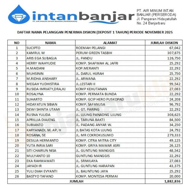 KBK.News, BANJARBARU — PT Air Minum (PTAM) Intan Banjar (Perseroda) resmi mengumumkan Program Deposit Pelanggan untuk periode November 2025. Program ini dirancang sebagai solusi praktis bagi pelanggan yang kerap bepergian ke luar daerah dalam waktu lama sehingga berpotensi terlambat membayar tagihan air.