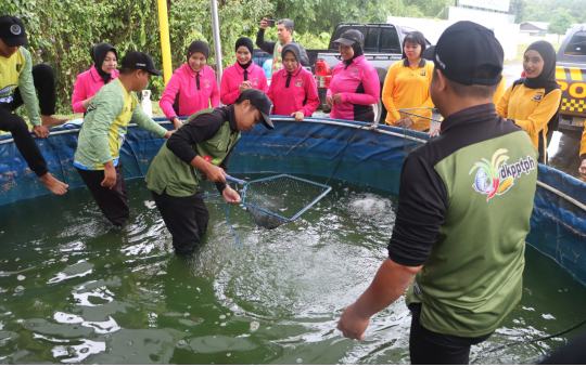 - Panen Ikan & Sayuran: Bhayangkari dan Polwan memanen ikan dari kolam bioflok serta sayuran segar dari green house.