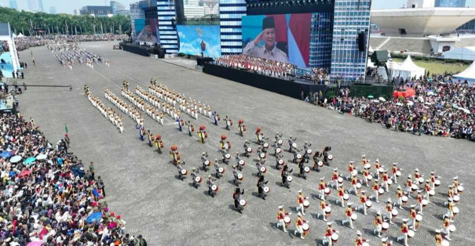 Dari mimbar kehormatan, Presiden Prabowo tampak khidmat memperhatikan setiap atraksi yang ditampilkan para prajurit.